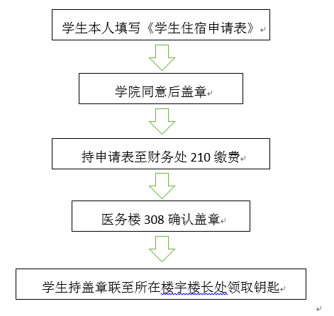因退伍复学、走读返校、病愈复学等原因需返校住宿,申请床位的,请填写《学生住宿申请表》向所在学院提交申请,学院同意后盖章,学生持申请表至财务处210缴费,之后将申请表交至医务楼308,经确认后办理完成住宿申请手续,持盖章联至所住楼宇宿管阿姨处领取钥匙。