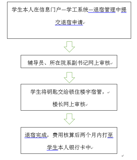 若学生因休学、入伍、走读、退学等原因需申请退宿,需由学生本人在“信息门户—学工管理系统—退宿管理”中提交退宿申请,经辅导员、学生所在学院副书记网上审核后,学生本人将钥匙交给所住楼宇宿管,楼长网上审核,退宿费经核算后两个月内学生本人银行卡。