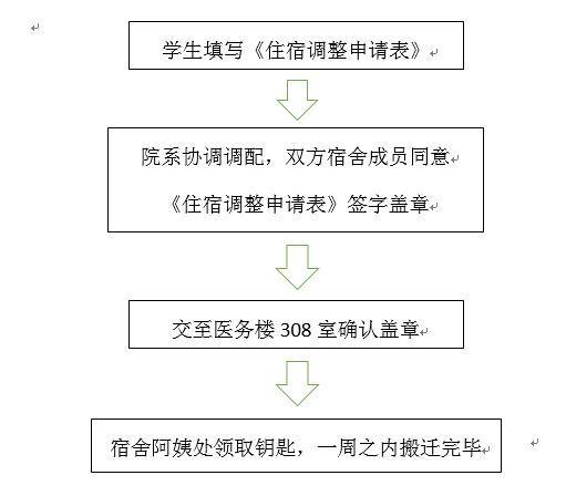 若学生因身体原因、心理因素、生活习惯等原因确需进行宿舍确需进行宿舍调整的,由学生本人填写《学生住宿调整申请表》(见附件1)向所在院系提出申请,院系同意后根据现有住宿情况进行协调调配并经双方宿舍成员同意,由辅导员在申请表上签字盖章,并交至医务楼308,经确认床位可调整后盖章,并由学生持已盖章的申请表一联至宿舍阿姨处领取新宿舍的钥匙。学生须在一周之内搬好寝室,否则申请作废。