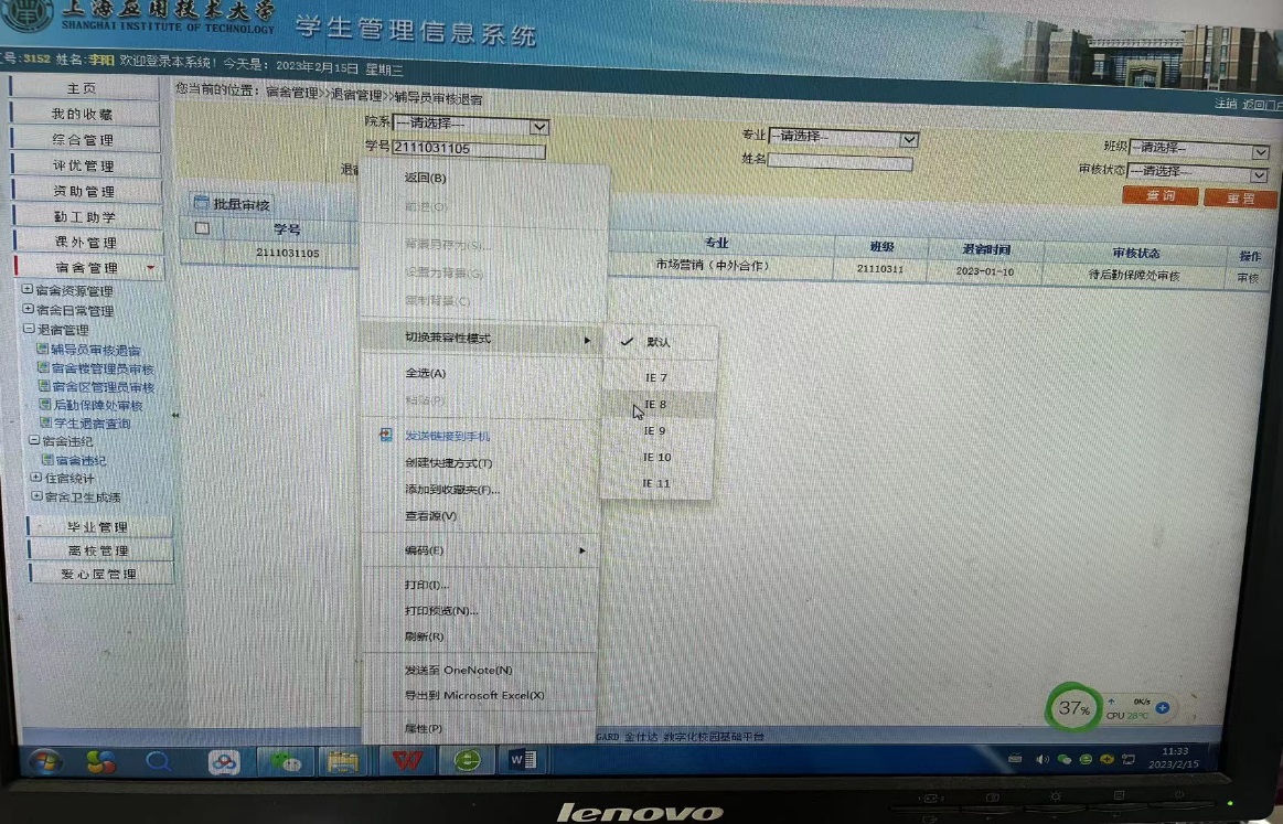 退宿系统使用指南:学生需用电脑登录信息门户,点击左上角“学工管理”栏目,进入后左边目录栏点击“退宿管理”,之后可根据实际情况填写提交。此系统建议使用360浏览器,设置为兼容模式(见图1所示,点击地址栏右侧小图标可切换),使用应该没问题。若依然点不开,将鼠标移至网页空白处,右击,移至“切换兼容模式”,选择IE8,将网址设置浏览器内核为IE8及以上版本。(见图2所示)
